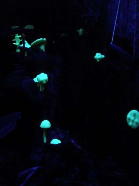I had some old Sculpey II laying around so I made some mushrooms after checking out this post. I snipped off the the tip of some wood shish-kabobs and formed clusters around them with glow in the dark clay. I then stabbed the wood into the cork bark on my background and that's it.